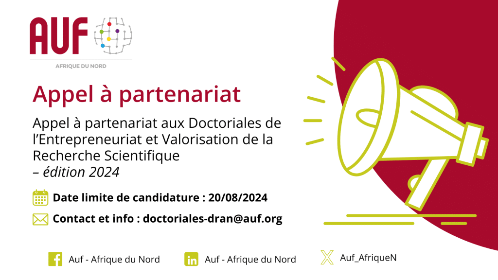 L’AUF Afrique du Nord lance un appel à partenariat dans le cadre des Doctoriales de l’Entrepreneuriat et de la Valorisation de la Recherche 2024. Cet appel s’adresse aux incubateurs, fondations, agences et structures d’accompagnement actives dans l’entrepreneuriat et la valorisation des résultats de la recherche en Afrique du Nord.