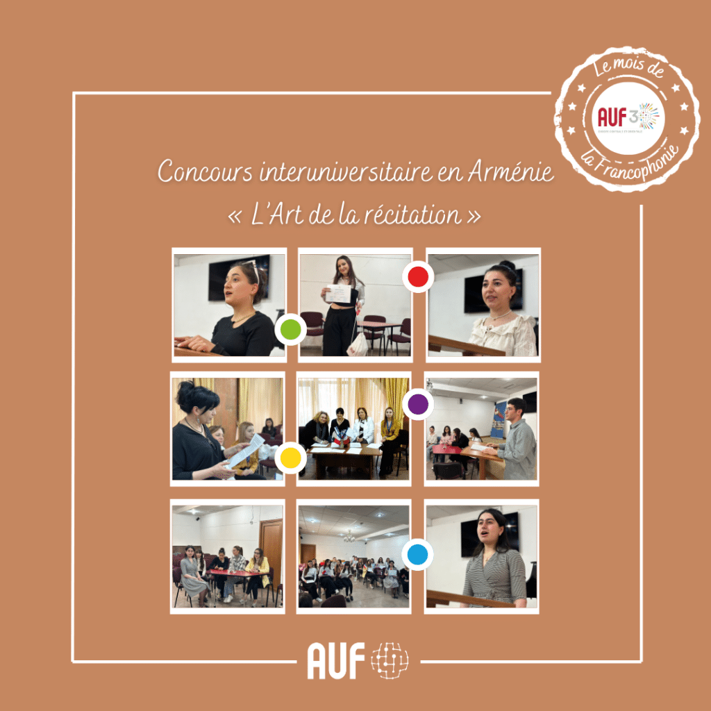 Dans le cadre des activités du Mois de la francophonie, le Bureau National de l’AUF en Arménie, l’Université d’État V. Brusov, Université française en Arménie (UFAR) et le Centre de la Francophonie de la Bibliothèque Centrale Av. Isahakyan ont organisé le 3 avril 2024 le concours « L’art de la récitation ».