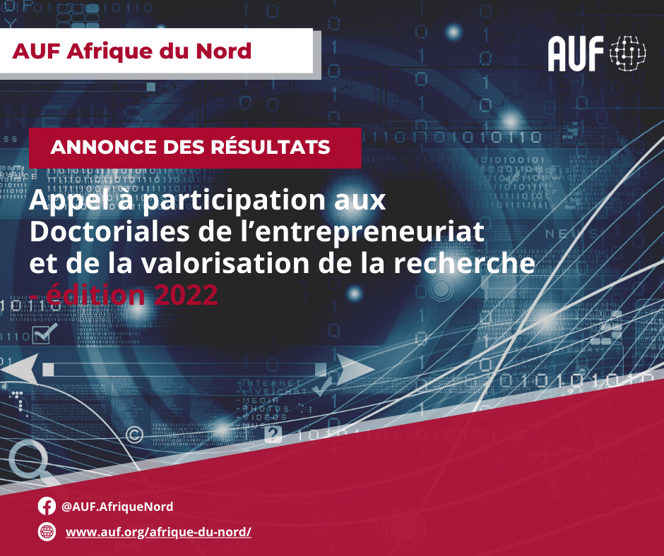 Pour rappel, les Doctoriales de l’entrepreneuriat et de la valorisation de la recherche – édition 2022 visent à accompagner les doctorants, issus d’universités membres de l’AUF de l’Afrique du Nord, à valoriser leurs résultats de recherches à travers une méthodologie de recherche-action et une sensibilisation à l’entrepreneuriat. Pendant 5 jours, les doctorants (Algérie, Tunisie et Maroc) bénéficieront d’une série d’ateliers pour s’initier à la culture entrepreneuriale, encourager la collaboration avec les acteurs socio-économiques, en les invitant à se questionner sur les aspects en lien avec la valorisation des résultats de la recherche scientifique et l’impact sociétal et durable de la science.
