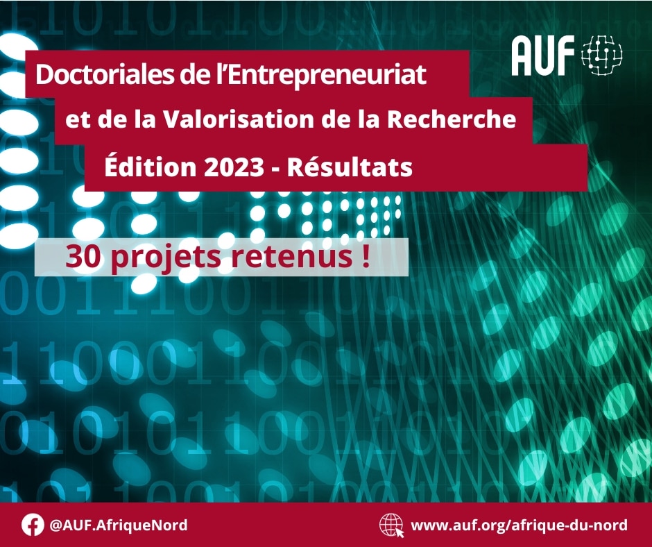 Pour rappel, les Doctoriales de l’entrepreneuriat et de la valorisation de la recherche – édition 2023 visent à accompagner les doctorants, issus d’universités membres de l’AUF de l’Afrique du Nord, à valoriser leurs résultats de recherches à travers une méthodologie de recherche-action et une sensibilisation à l’entrepreneuriat.