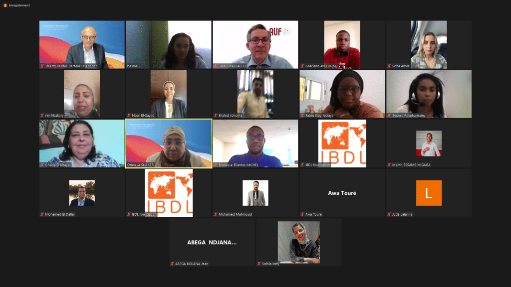 Après plusieurs mois de formation, de travail et de finalisation de projets, la séance de clôture de la deuxième édition de la compétition virtuelle régionale en entrepreneuriat (REC), organisée dans le cadre du projet CIPIEE (Carrières et insertion professionnelle, innovation et entrepreneuriat en Égypte), s’est tenue en ligne le mercredi 18 mai 2022, en présence de M. Jean-Noël BALEO, directeur régional de la direction du Moyen-Orient de l’AUF, M. Thierry VERDEL, recteur de l’Université Senghor, M. Mohamed Rachad représentant de la fondation IBDL (International Business Driving License), et plusieurs membres du corps professoral de différentes universités ainsi que les meilleures 10 équipes qui ont participé à la compétition.