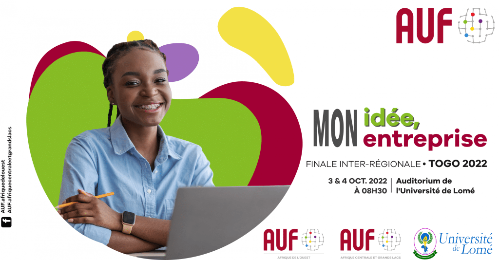 L’Agence Universitaire de la Francophonie (AUF) organise du 03 au 04 octobre 2022, à l’Université de Lomé (Togo), la finale inter-régionale (Afrique centrale et Grands Lacs et Afrique de l’Ouest) du concours d’entrepreneuriat étudiant « Mon idée, mon entreprise ».