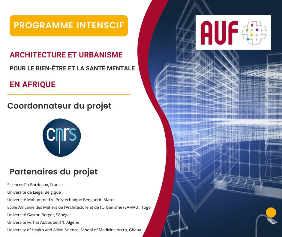 Dix projets ont été sélectionnés au sein du programme IntenScif* de l’AUF Europe de l’Ouest. Parmi ceux-ci, le projet Architecture et urbanisme pour le bien-être et la santé mentale en Afrique (RUSH) coordonné par le Centre National de la Recherche Scientifique – CNRS (France) en partenariat avec un consortium de 7 universités** (Algérie, Belgique, France, Ghana, Maroc, Sénégal et Togo).
