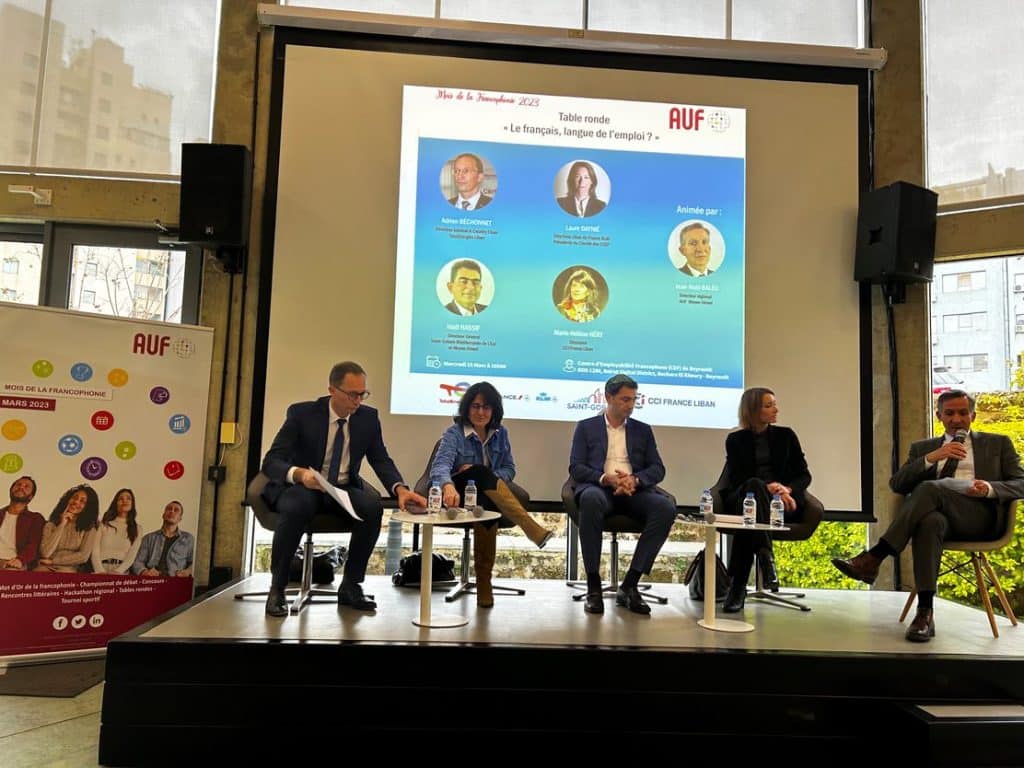 A l’occasion du Mois de la francophonie 2023, l’Agence Universitaire de la Francophonie (AUF) a réuni de grands employeurs, cadres dirigeants régionaux d’entreprises mondialisées, autour d’une table ronde, le 15 mars, au Centre d’Employabilité Francophone (CEF) de Beyrouth, autour de la question « Le français, langue de l’emploi ? ».