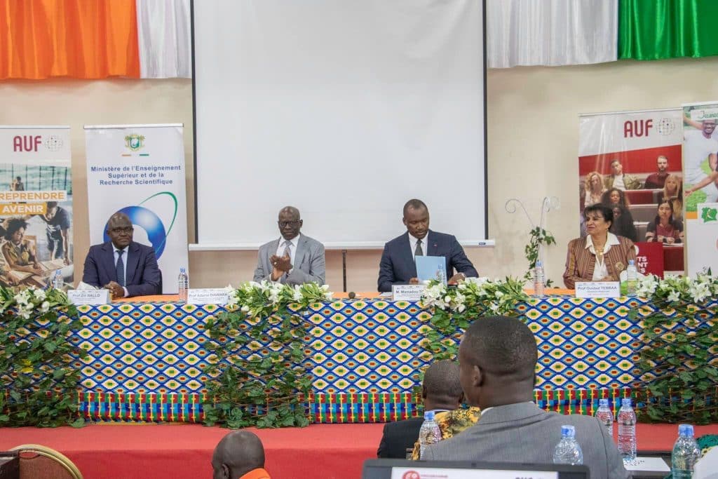 Le Professeur Adama Diawara, Ministre de l’Enseignement supérieur et de la Recherche scientifique et Monsieur Mamadou Touré, Ministre de la Promotion de la Jeunesse, de l’Insertion professionnelle et du Service civique, ont procédé au lancement du Statut National de l’Etudiant Entrepreneur (SNEE) le jeudi 9 novembre 2023, à l’Université Félix Houphouët-Boigny, en présence de la Directrice AUF – Afrique de l’Ouest, le Prof. Ouidad TEBBAA.