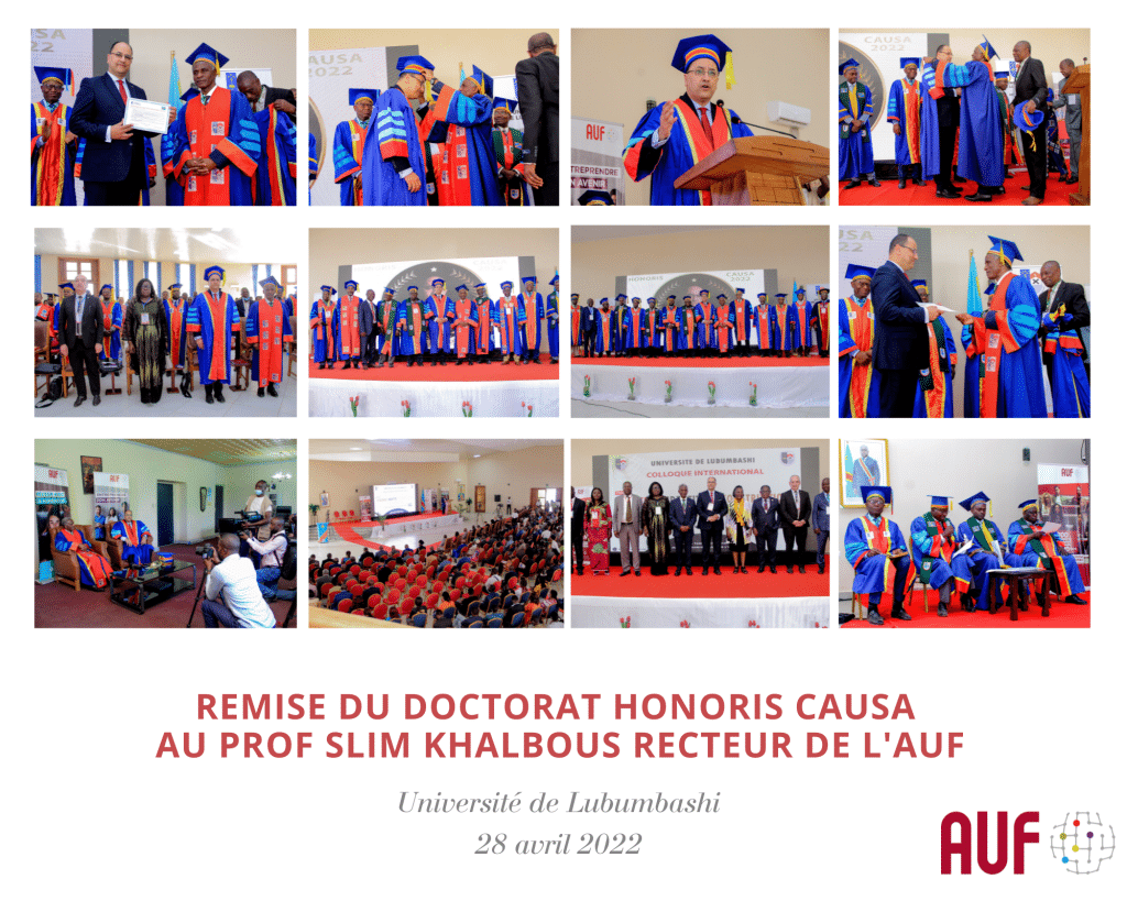 Au cours de sa visite officielle en République démocratique du Congo du 25 au 29 avril 2022, le Recteur de l’Agence Universitaire de la Francophonie (AUF) a reçu le diplôme de doctorat honoris causa de l’Université de Lubumbashi le 28 avril 2022.