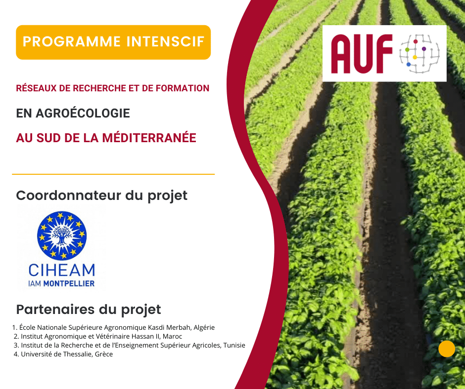 Le projet de Réseaux de recherche et de formation en agroécologie au Sud de la Méditerranée (MEDAE) est coordonné par le Centre international de Hautes Études Agronomiques Méditerranéennes – CIHEAM (France) en partenariat avec un consortium de 5 universités (Algérie, France,Grèce, Maroc, Tunisie).