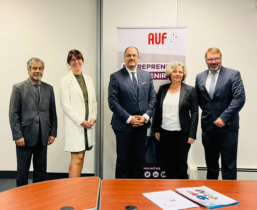 Une réunion s’est tenue aux bureaux des Services Centraux de l’AUF à Montréal. Elle a réuni Monsieur Patrice BACHAND, Directeur, direction de la Francophonie et de la Solidarité internationale, Ministère des Relations internationales et de la Francophonie (Québec), Madame Myriam PAQUETTE-CÔTÉ, Directrice des relations extérieures, Ministère de l’Enseignement Supérieur (Québec), Prof. Slim KHALBOUS, Recteur de l’AUF, Madame Marie Nathalie LEBLANC, vice-rectrice de l’AUF et Monsieur Abderrahmane RIDA, secrétaire général de l’AUF.