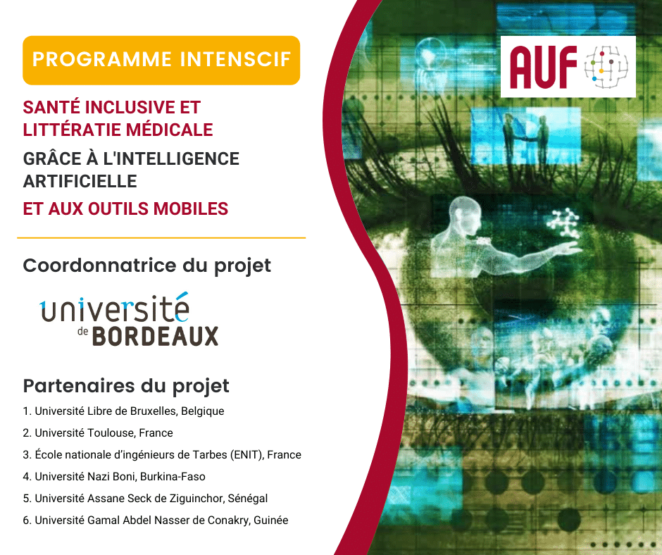 Dix projets ont été sélectionnés au sein du programme IntenScif* de l’AUF Europe de l’Ouest. Parmi ceux-ci, le projet “Santé inclusive et littératie médicale grâce à l’IA et aux outils mobiles (SAMIA)” coordonné par l’Université de Bordeaux (France) en partenariat avec un consortium de 6 universités** (Belgique, Burkina-Faso, France, Guinée et Sénégal).